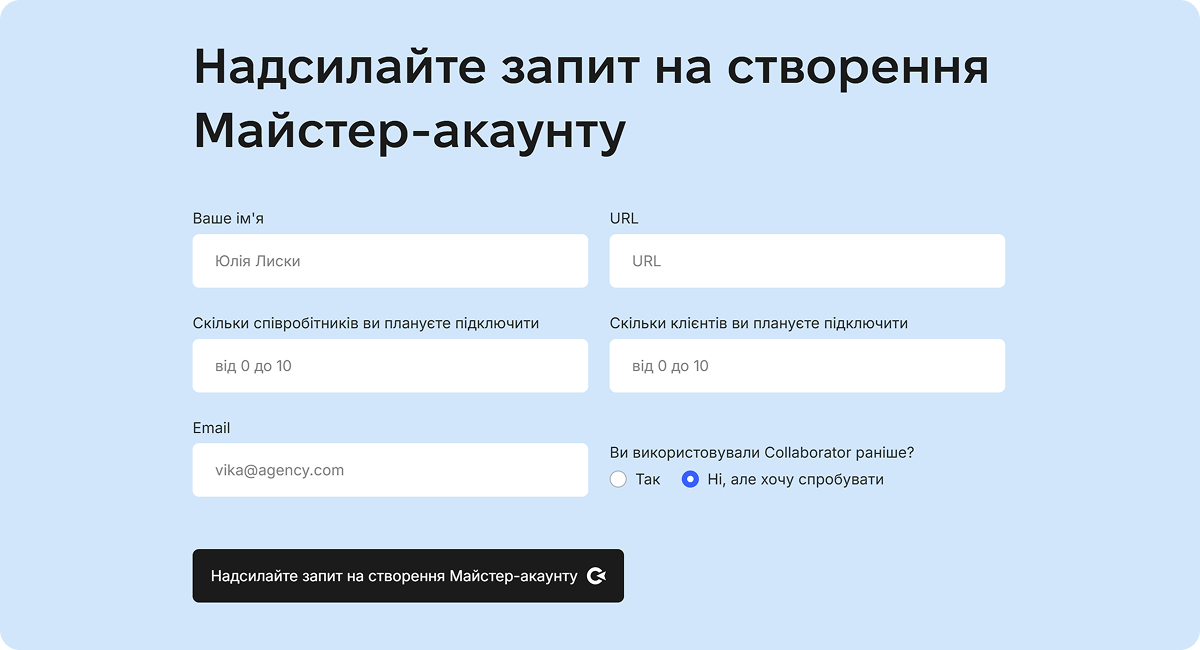 Якщо ж запрошується Клієнт, то це може бути як новий обліковий запис, так і наявний. Принцип аналогічний: вкажіть email та надішліть запит.