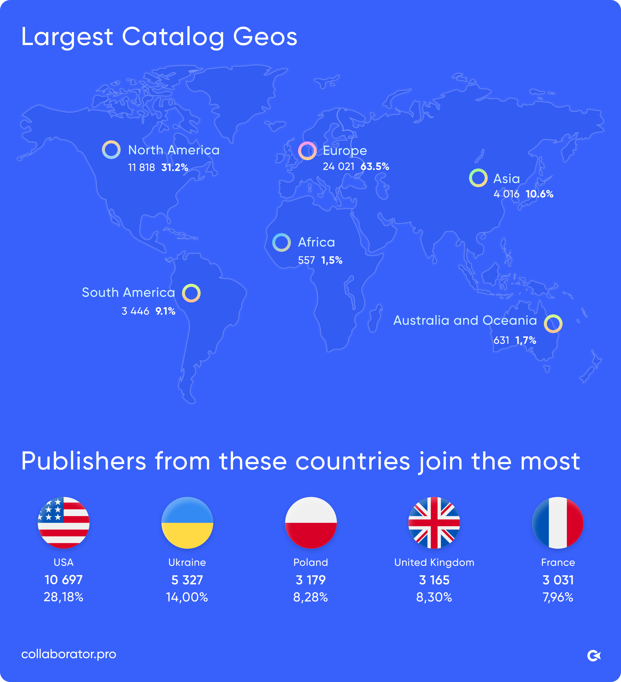Global map of Collaborator’s largest catalog geographies in 2025, plus top countries with the most new publishers: USA, Ukraine, Poland, United Kingdom, and France.